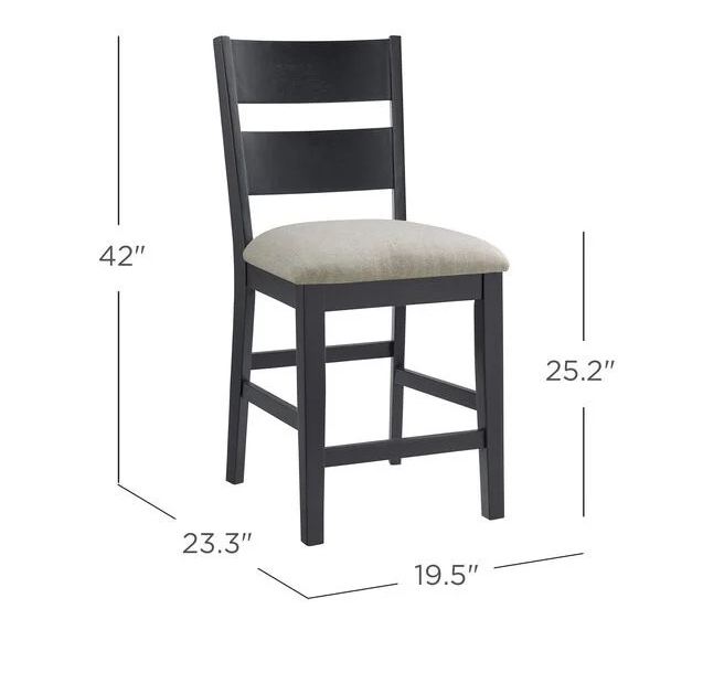 Expertly crafted with durable, sturdy solid rubberwood and comfortable beige fabric upholstery, these black counter height chairs provide exceptional quality seating. The foam cushions sit on webbed suspension for added comfort, while the metal capped footrest ensures durability. With a hand-applied, multi-step finish, these chairs also feature protective floor glides. Measuring 19.5" L x 23.3" W x 42" H and weighing 20.5 lbs, these chairs have a seat-height of 25.2".