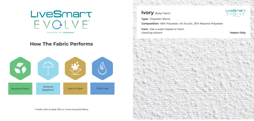 - Foam seat pads are upholstered in an ivory LiveSmart performance fabric to deliver comfort and durability