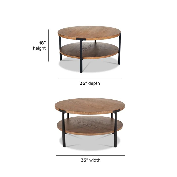 Sophistication meets rustic, industrial charm with the Millwork round coffee table. Seamlessly blending high-contrast materials and finishes in perfect harmony, this table makes a captivating statement in any living space. A textured steel frame is highlighted by warm copper undertones, while a distinctive wood top and lower shelf exude character with natural knots, subtle saw marks and a white cerused finish that accentuates the rich umber wood grain.